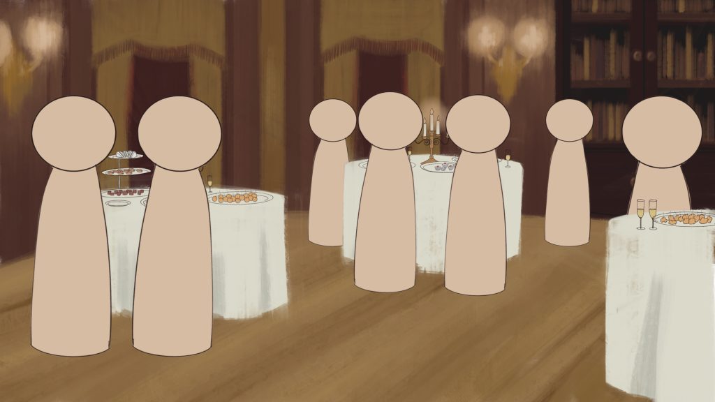 My idea was to set this communication in a banquet. So I found some illustrations of banquets. During this time, I found a film “Crimson Peak”, I really enjoy the dance part in the film, I also like the colour style and the environment of that part. So I decided to use this style to design my characters and environment. And I extracted a lot of colours from the dance part in that film.